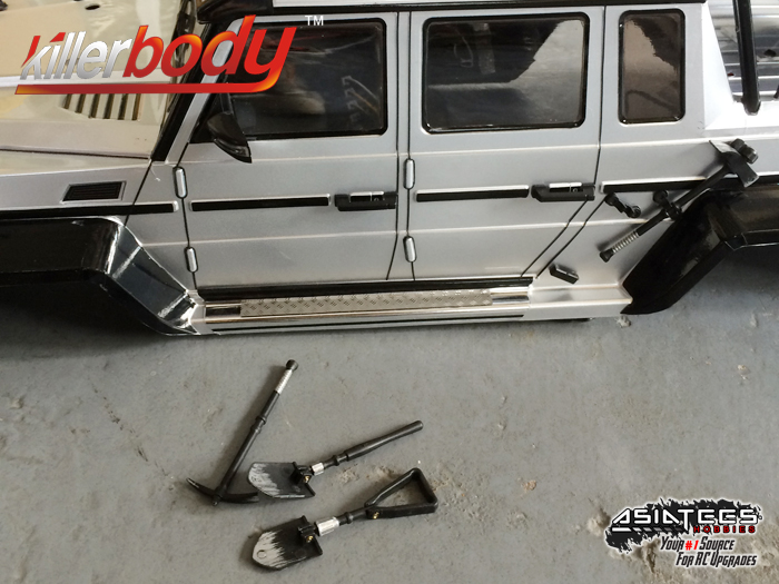 Killerbody made their body shells with a lot of accessories to fulfill our needs for realistic details and irresistible attractiveness. Besides accent light which has become a common part to upgrade with, the wing mirror of Horri-Bull is upgradeable. With lights on your wing mirror, isn't this more realistic than ever? You can use the high tactile air intake mesh to modify the front body. Add aluminum intercooler and decorative hooks and rings to your Horri-Bull. What's more? Killerbody has prepared a decorative ladder for you. All the tools are moveable just like the real wild tools.
