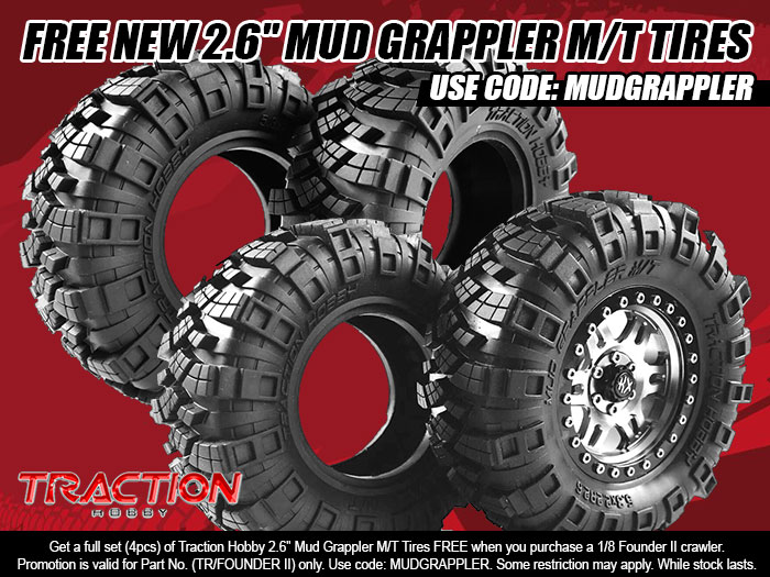 For a limited time, get a set of these Mud Grappler FREE when you order a 1/8 Founder II Crawler ARTR. Use this exclusive code: MUDGRAPPLER at the shopping cart to get them. While supplies last.