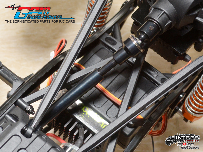 Originally, Axial's WB8 driveshaft set is plastic molded, which it can only withstand so much bashing that these plastic shaft will eventually bend or break. So what's so special about GPM's steel main shaft is that it is a direct replacement of the stock plastic. Unlike the stock part, which the driveshaft is a two piece part, GPM has made it so that you won't have to worry about loosing your other half. The steel main shaft is a single piece but fully adjustable.