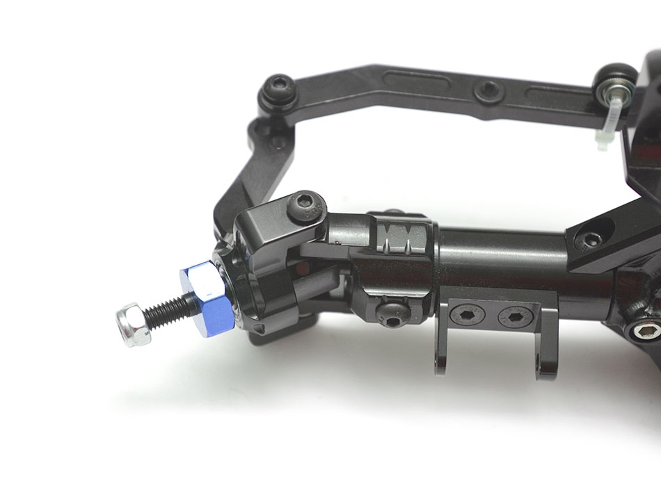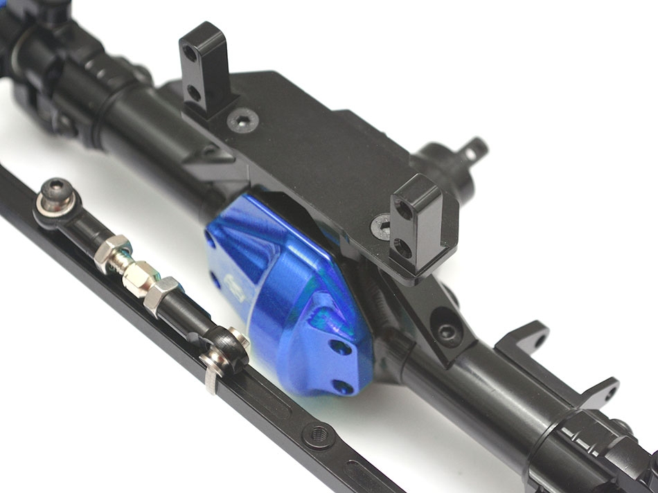 The front axle is set up for Y link (3 link) and the rear is a 4 link set up. If you want to use 4 link setup on the front axle the servo cannot be mounted on the axle