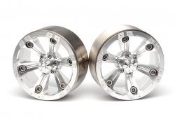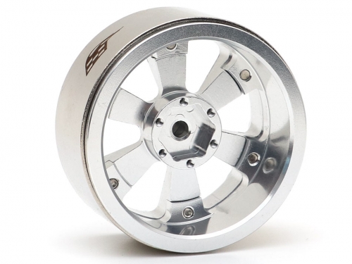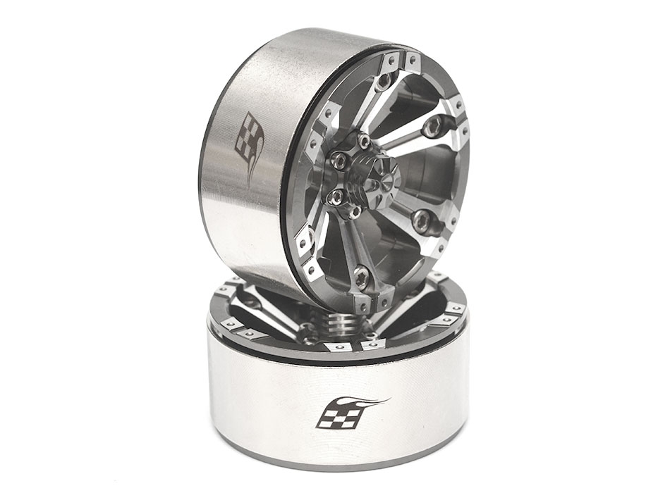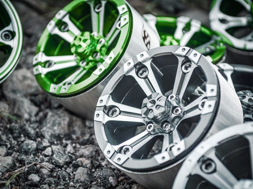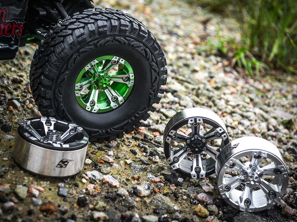 Packing 115g of extra weight per wheel, these monster wheels are compatible with a wide range of 1/10 crawlers, such as the Axial SCX10, Wraith, or TF2. CNC-machined from aluminum. Available in a range of styles. Anodized finish available in metallic green, black, silver or gunmetal colors.