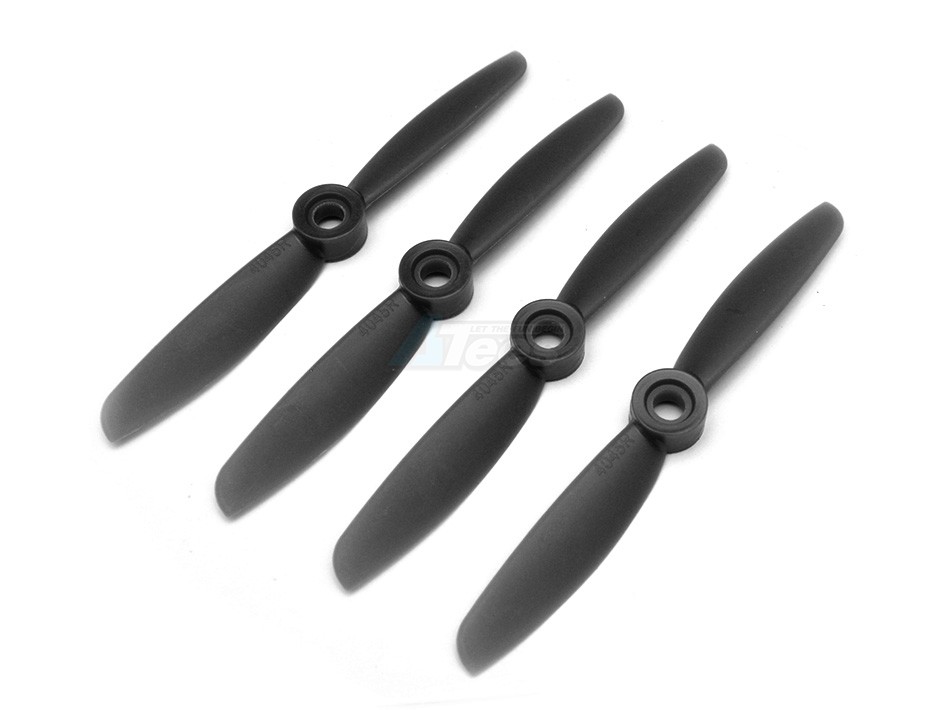 A set of four (4) counter-clockwise Gemfan 4-inch propellers, 2-blade style with a 5mm center hub. Stiffer and stronger than the plastic versions.