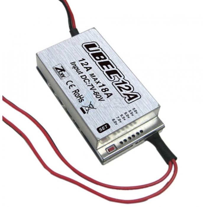 Output: Adjustable 5.0V / 5.5V / 6.0V / 6.5V / 7.0V / 8.0V @ 12A (changeable with jumper) Input Voltage: 7V-60V (2-14s LiPo; 6-50 cell Ni-XX) Output Current: 12A Continuous, 18A Burst Weight: 18g Dimensions: 60 x 34 x 15mm For more details please refer to the official ZTW manual for this product here.