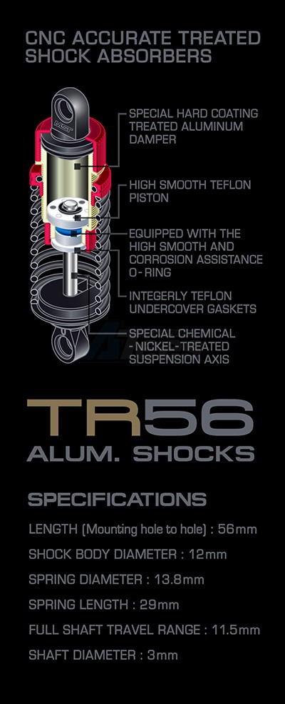 - This is TR56 Aluminum Damper Set (4). CNC accurate treated shock absorbers.