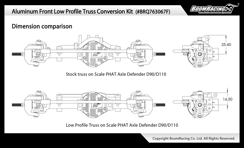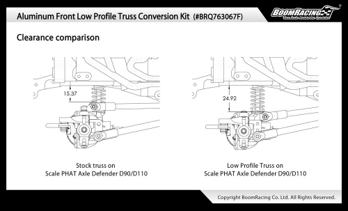 - This Front Low Profile Aluminum Truss Conversion Kit gives you additional clearance and shock travel for front axle of Team Raffee Co. D90/D110.