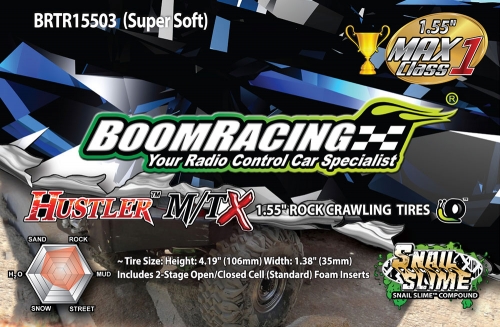 - Factory description: Boom Racing HUSTLER M/T Xtreme 1.55" MC1 Rock Crawling Tires 4.19x1.38 SNAIL SLIME™ Compound W/ 2-Stage Foams (Super Soft)