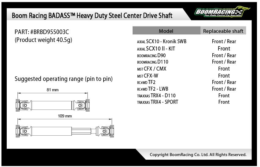 • Factory description: Boom Racing Axial SCX10 II BADASS™ HD Steel Center Drive Shaft Set for Axial SCX10 II Kit Front & Rear (2)