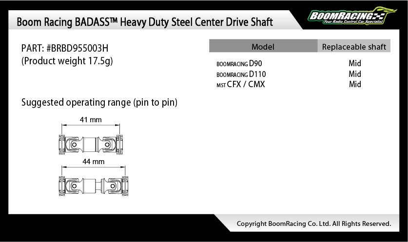 - Factory description: Boom Racing Team Raffee Co. TRC-D110 Complete BADASS™ HD Steel Center Drive Shaft Set for Boom Racing D90/D110 Chassis Front Center & Rear (3)