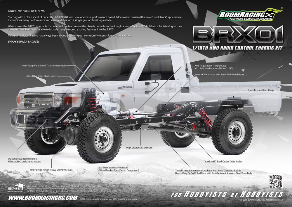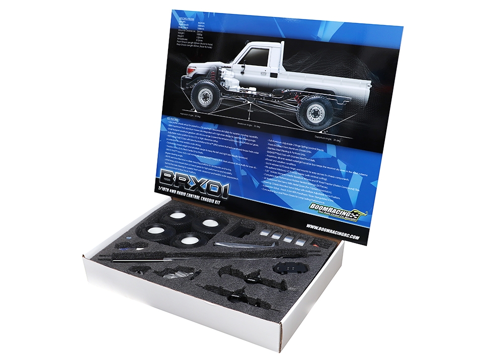 Starting with a clean sheet of paper the 1/10 BRX01™ was developed as a performance based R/C crawler chassis with a scale "stock truck" appearance. It combines many performance and scale features into a single ground breaking vehicle.What makes the BRX01™ special is that many of the features on the chassis come from the imaginations of fellow R/C hobbyists. By listening to their ideas and feedback, we are able to include many new and exciting features into the BRX01™.