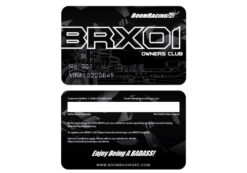 All BRX01™ chassis kits include a BRX01™ Owners Card. As the original owner, you are eligible to receive a special promotion at each of the events being attended by Boom Racing.