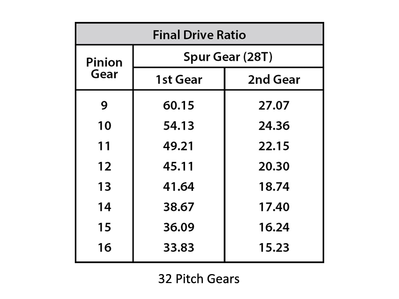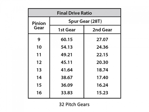 - Gear Pitch: 32P Pinion/Spur, 48P T-Case