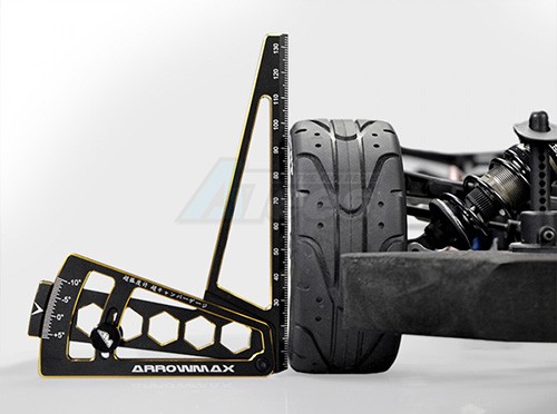 The all new CNC-machined black and golden Super Camber Gauge is the latest invention by Arrowmax. Besides having a setup system to check the camber, having an external way to measure makes it important for racing as well. Without having to switch back to back, the super camber gauge allow racers to check measurements on both sides. The lazer marking helps achieve precision. The Arrowmax Super Camber gauge is available in both 1/10 and 1/8 sizes for your on-road and off-road needs.