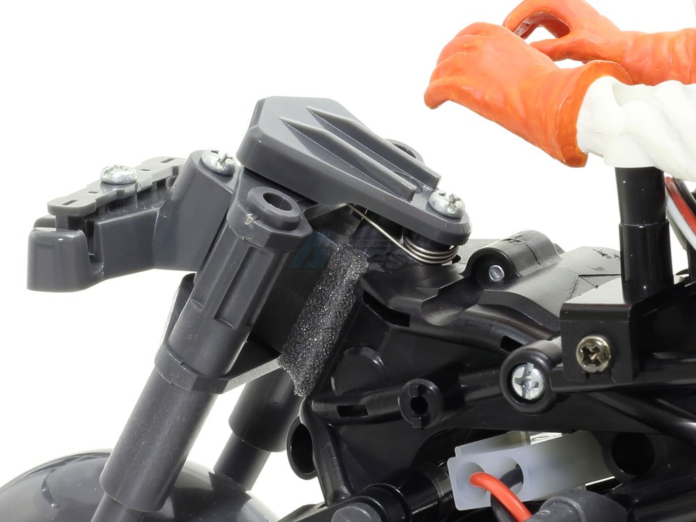 Support arms are moved by the servo, and help the model to self-right in the event that it turns onto its side. At the front, a telescopic fork has a built-in coil spring, while the rear features a cam-slide setup with cams on the rotating pitch axis: sliding left and right, they actuate the built-in coil spring to cushion the rear. A planetary differential gear is integrated into the rear axle.