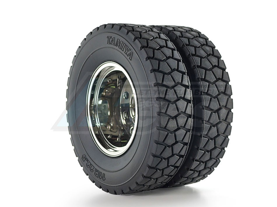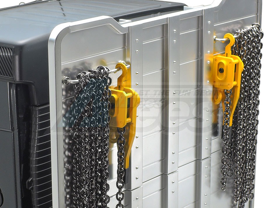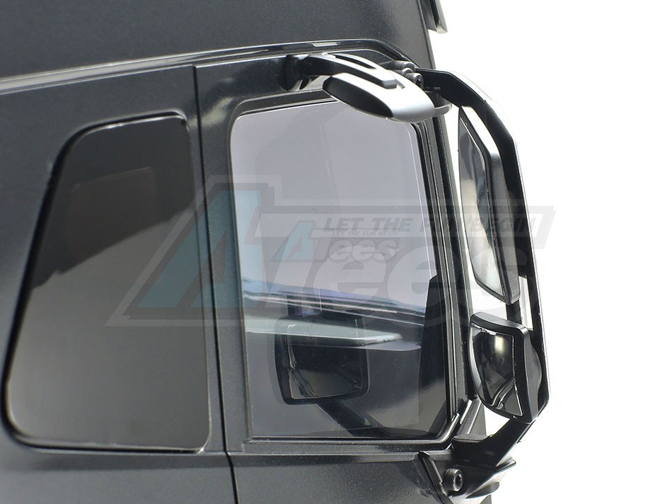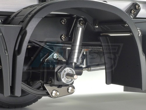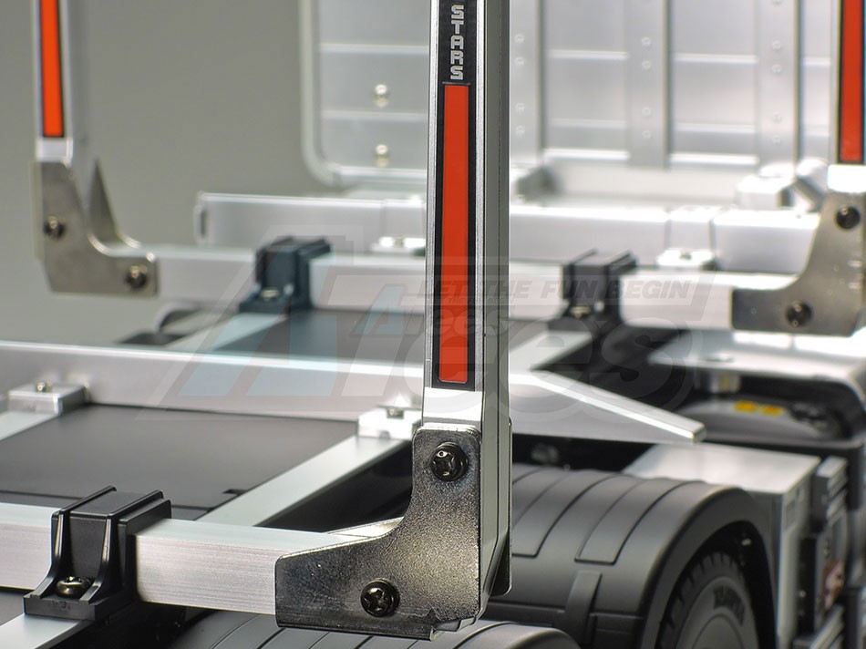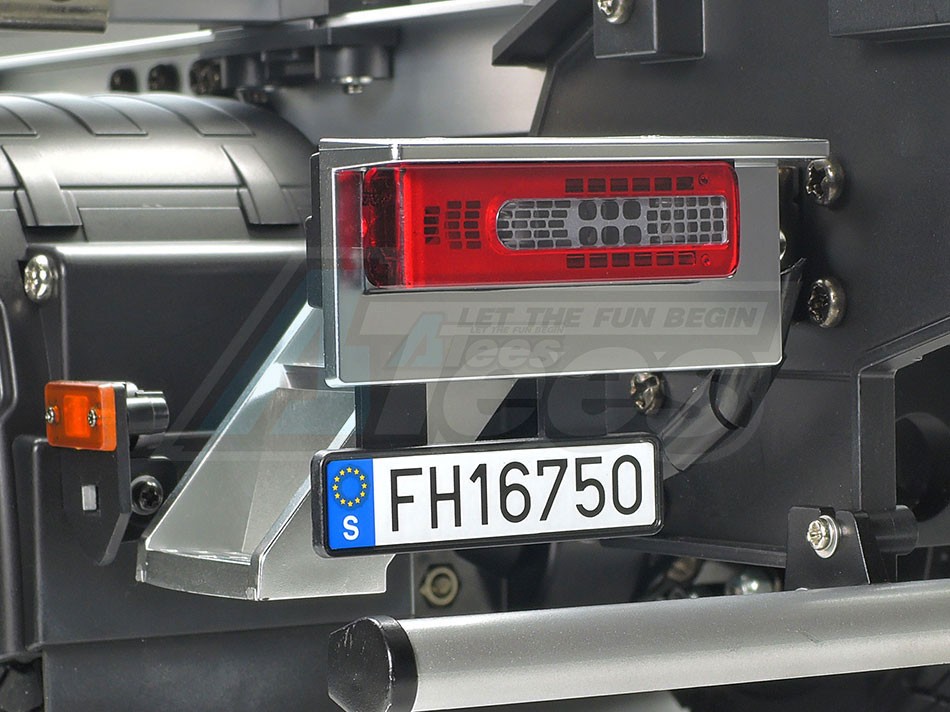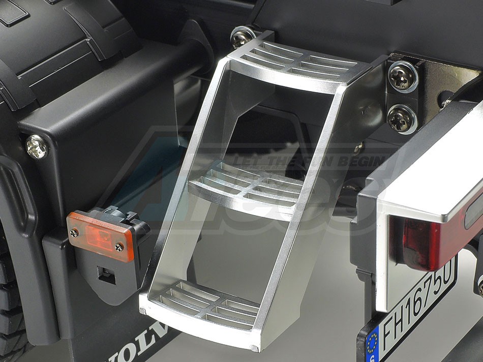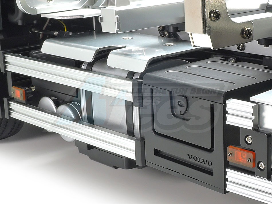 The Tamiya rendition faithfully captures the truck’s modern form with the use of ABS plastic body parts and a number of metal chassis components. One look at the detailed interior and auxiliary equipment, such as air tanks, will confirm that the body features replica-quality realism, which is further enhanced with metal transfers depicting emblems and numerous metal-plated parts.