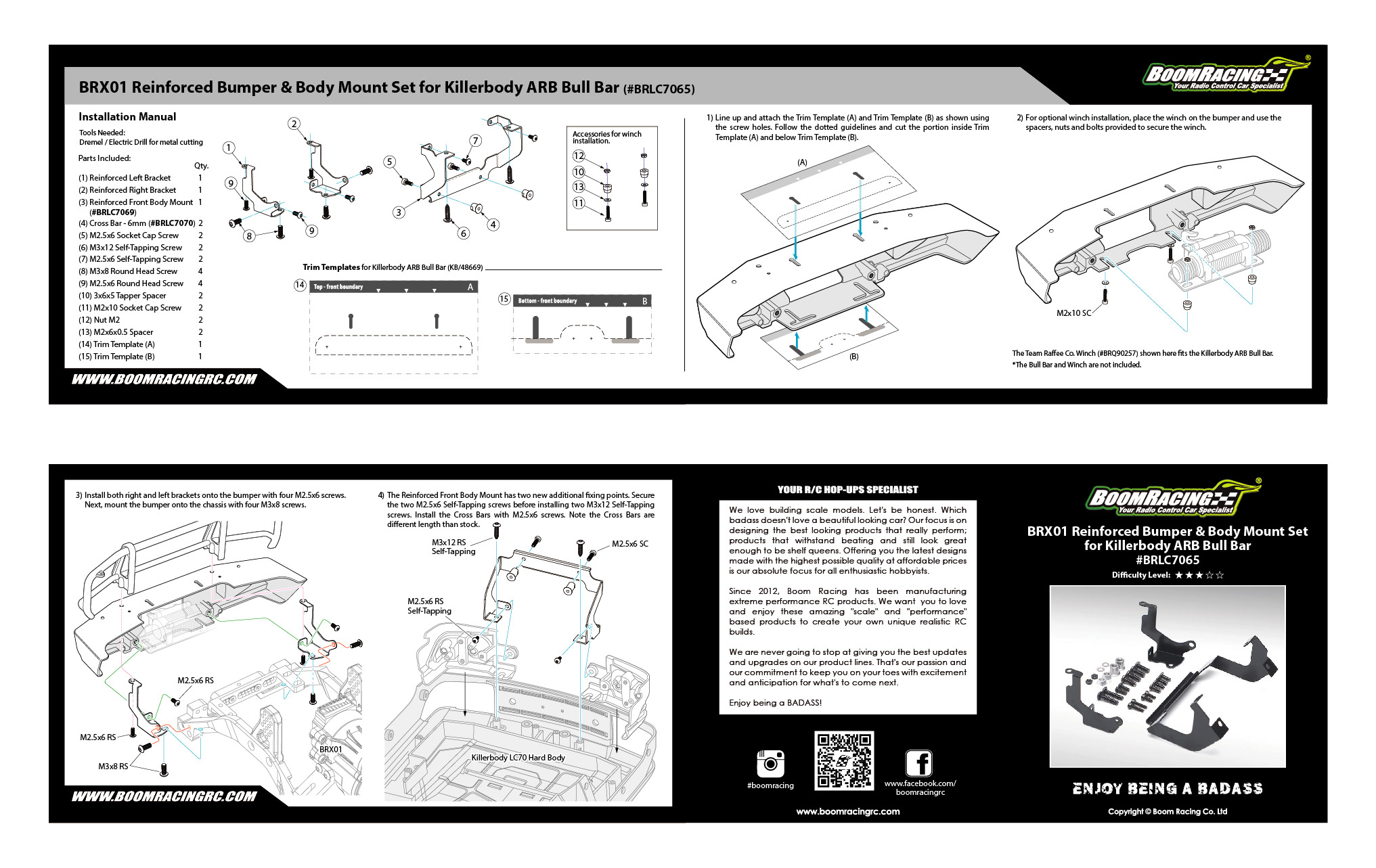 - Factory description: Boom Racing Boom Racing BRX01 BRX01 Reinforced Bumper & Body Mount Set for Killerbody ARB Bull Bar