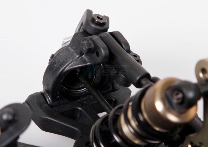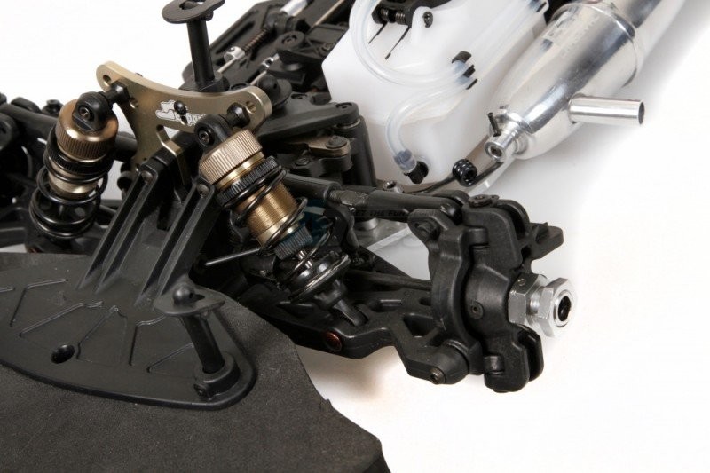 Durable longer oversized lower suspension arms in strong composite nylon. On the lower side the special downstops screws are mounted. The lower shock-mounting pins are secured with a small grubscrew from the bottom.