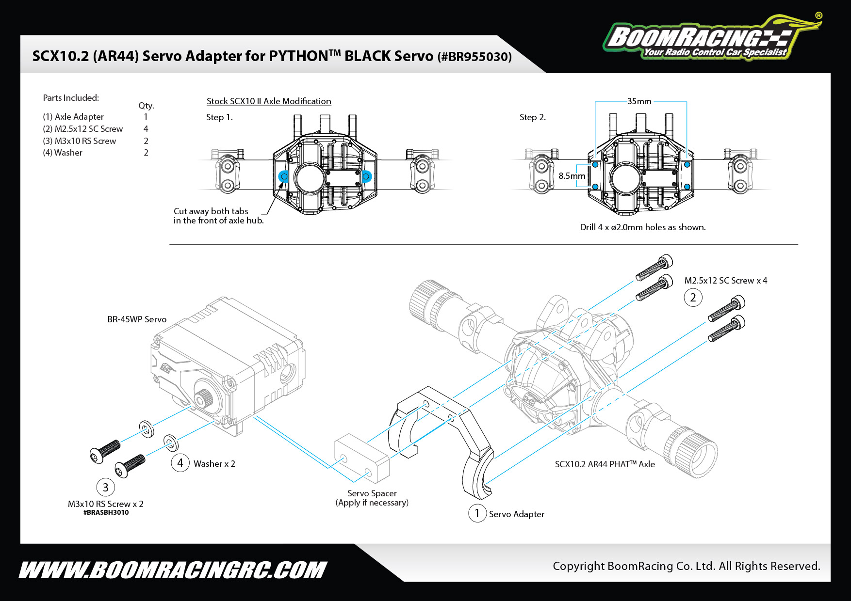 - Factory description: Boom Racing Axial SCX10 II SCX10 II (AR44) Servo Adapter for PYTHON BLACK™ Servo