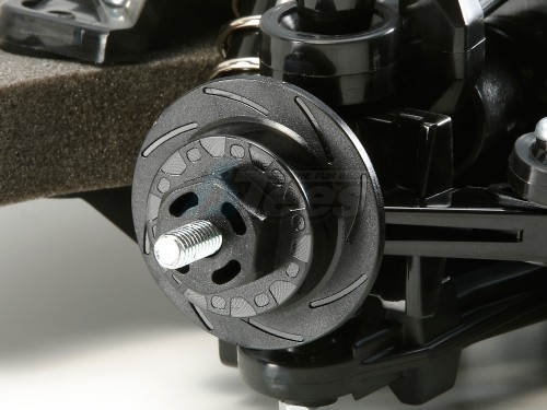 The shaft-driven 4WD TT-02 chassis employs a longitudinal layout with the battery on the left and the motor on the right, to give excellent stability. In addition, it features identical left and right suspension arms and uprights for ease of assembly, plus easy-to-maintain gearboxes. It is a highly adaptable chassis, as it offers 2 different wheelbases, 2 ground clearance settings and 2 tread set-ups in addition to a range of 10 possible gear ratios. It is not short on looks either, with brake disc-shaped wheel hubs and stylish front bumper supports.
