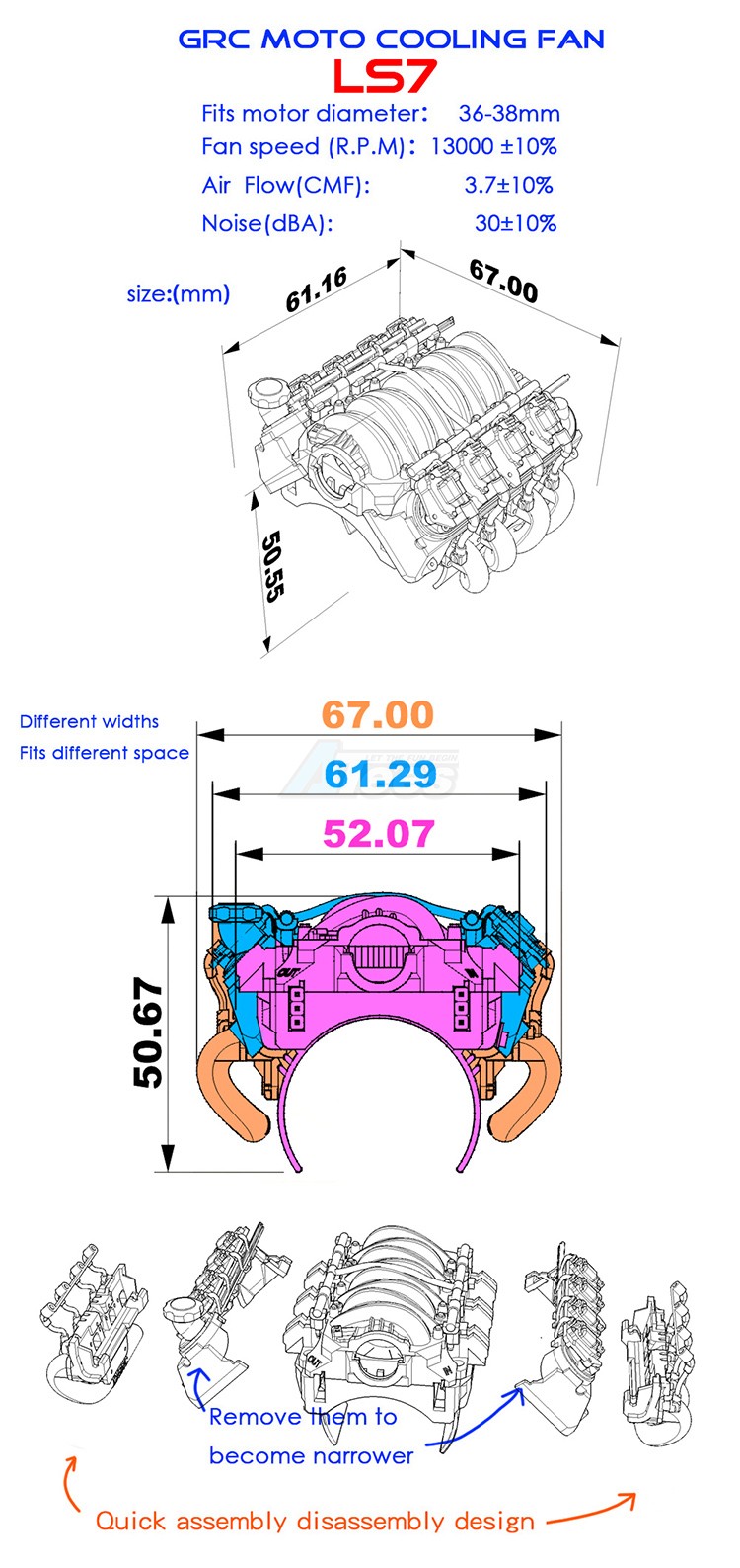 • Factory description: GRC LS7 Simulated V8 Engine/ Motor Heat Sink Cooling Fan For Crawler 36mm Motor