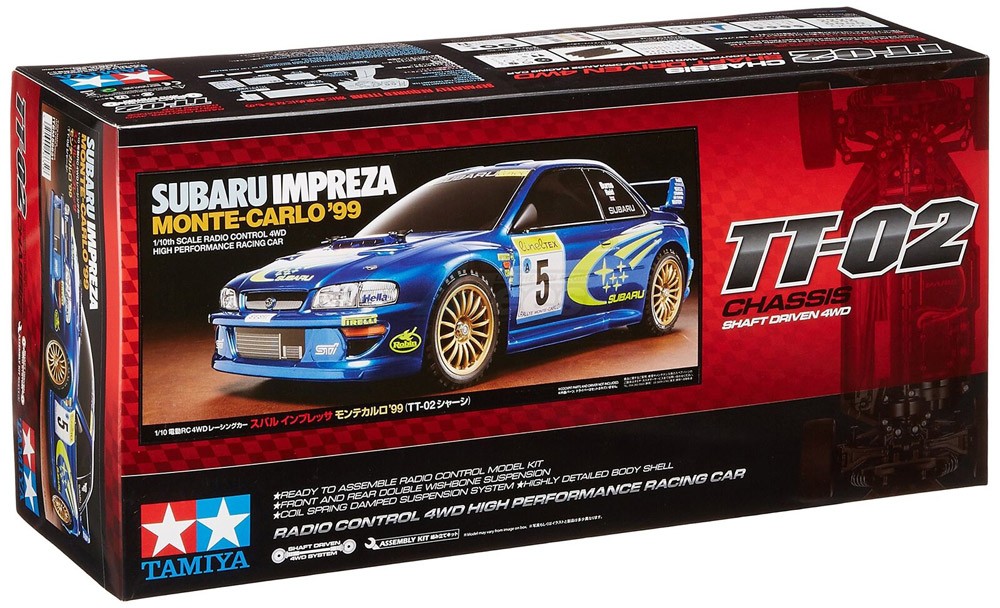 - The TT-02 chassis line-up is Tamiya's entry level 4WD platform. It allows new kit builders an easy gateway into the world of on-road running due to its easy construction, balanced performance and high aftermarket Hop-Up Option support. This TT-02 kit features the Subaru Impreza rally car that took part in the Monte Carlo Rally of the 1999 World Rally Championship (WRC) season. The Impreza was a legendary force in the WRC from the 1990s and into the next millennium, with 3 manufacturers' championships in a row from 1995-1997. In 1999 they were still competitive with an impressive 1-2 finish for drivers Kankkunen and Burns in Argentina (round 7).