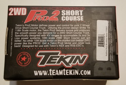 This is the Tekin Pro2 HD, 4100kV 4-Pole Brushless Motor. Tekin's Pro2 Motor is the definition of 2WD Short Course power and control. Specifically designed for use with the RX8 ESC, with kV ranges to accommodate either 2S/3S or 3S LiPo power systems, 2wd Short Course just got more fun. Utilizing the proven design of the T8 1:8th scale motor, the Tekin Pro2 delivers the smooth power and torque you demand for 2WD Short Course. No other 1/10 scale motor on the market can deliver 2WD power like the Pro2. Get a Tekin Pro2 motor and never look back!
