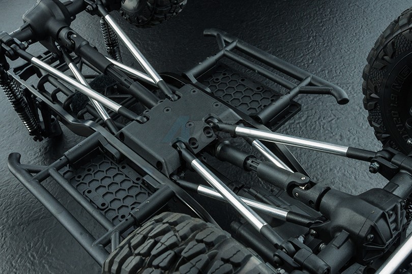 The realistic steel C-channel frame is endurable and real. The hex screw links the chassis and crossmember frames for the good torsional stiffness. The multiple shock mount positions are adjustable for the best performance by the player’s request. The streamlined design is easy for installation and maintenance.