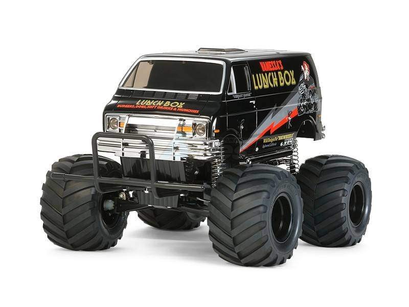 The popular Lunchbox model from Tamiya’s catalog makes a comeback in stylish black. This R/C assembly kit features the trademark boxy minivan body with metal-plated fenders, front grille and dampers, and includes a sticker set to add the finishing touches. All this is raised up over monster truck wheels cased in 115mm tires for a cool number that you can take for a spin any time, anywhere.