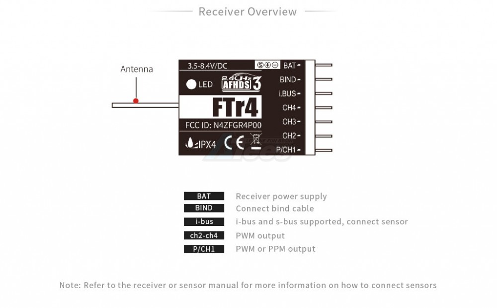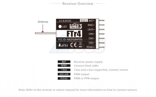 • Factory description: Fly Sky FTr4 2.4GHz 4CH AFHDS 3 RC Receiver Compatible Flysky Noble NB4