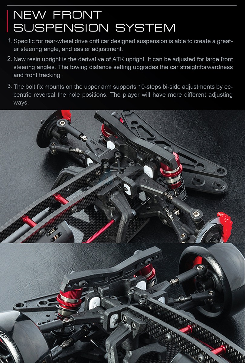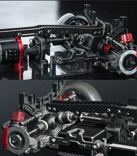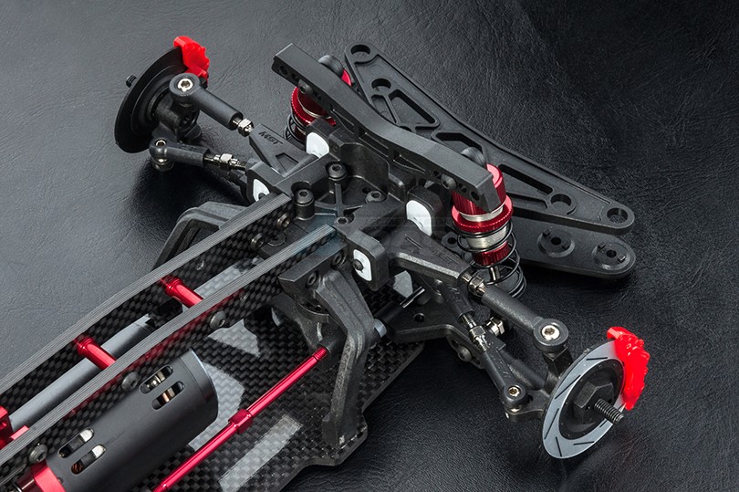 - Carbon fiber chassis with dual vertical carbon fiber upper deck.