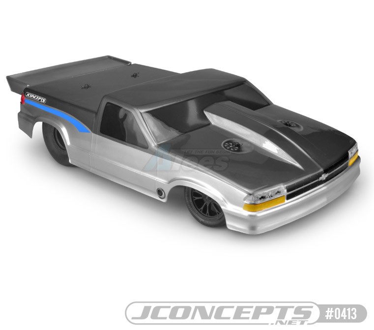 • The 2002 S-10 mimicked the larger Chevy pickups during this time with the horizontal bar grille and nicely rounded contours. It looks like a truck, no tricks, no gimmicks, just sincere serviceability and drive. At JConcepts, we had a project in mind, combining the versatility of a mid-sized truck and an all-out drag racing machine for Street Eliminator fanatics and speed-run drivers.