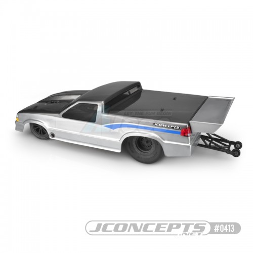 JConcepts has included a heavy hood-scoop touching off against the windshield and rounding into the front-end until tangency hits. The 13” wheelbase is positioned allowing flexibility on a variety of chassis builds including custom and Team Associated’s new DR10 vehicle. Fender flares are built into the rocker panel just as the scale S-10 and just open and flare enough to house drag racing tires such as the JConcepts Hotties.