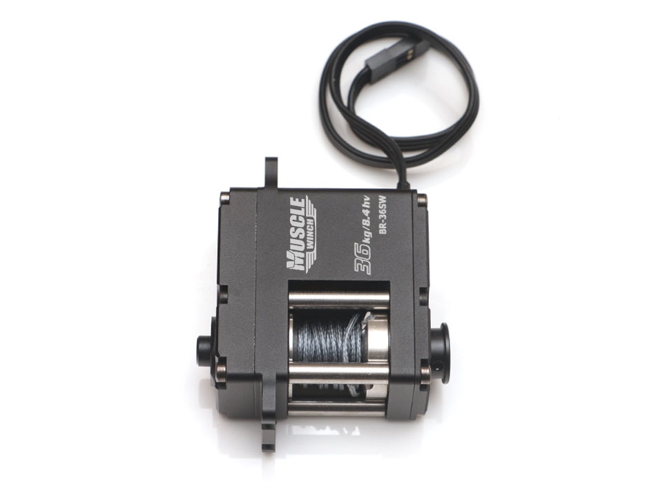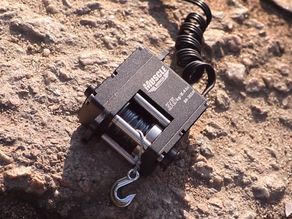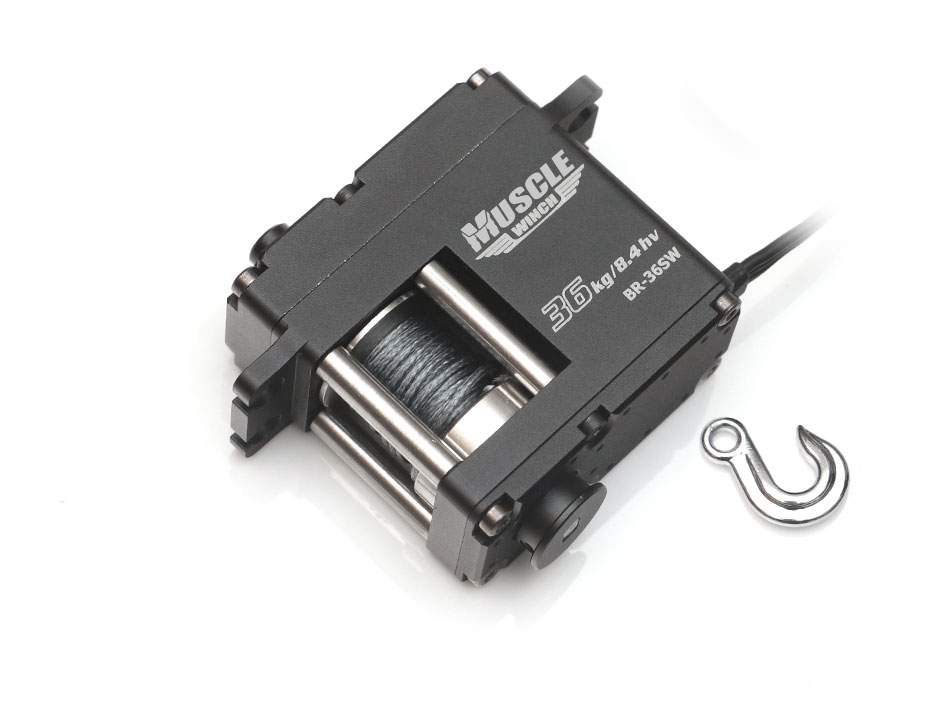 The Muscle Winch™ operates at 6V to 8.4V which produces up to 36KG of torque and features a billet aluminum case and full metal gears for strength and durability. A metal scale winch hook is included for the icing on the cake!