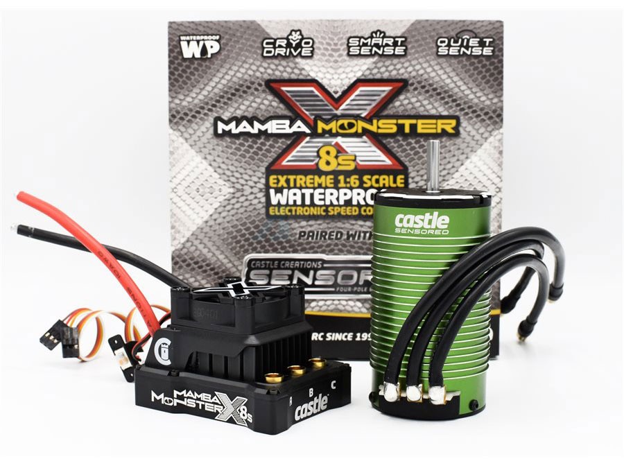 MORE POWER - COOLER TEMPS - LONGER RUNS Take your scale build or upgrade to the next level with Castle’s legendary brushless power. The MAMBA MONSTER X 8S, 33.6V ESC W/1717-1650KV SENSORED COMBO is a perfect upgrade for heavier 1:8th vehicles and lighter 1:6th vehicles weighing up to 20 lbs. and running up to 8S LiPo.