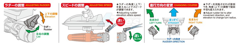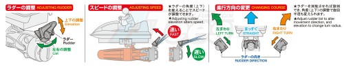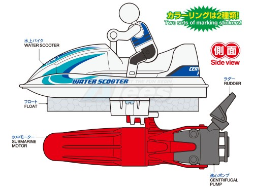 A rudder governs the direction of the expelled water: move it up and down to change speed, or left and right to steer the model. The model is made up of 6 parts and comes with 2 sets of marking stickers to choose from. A suction cup is included to allow use of the pump and motor in other models.