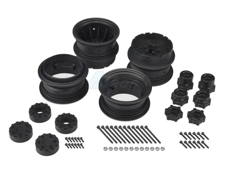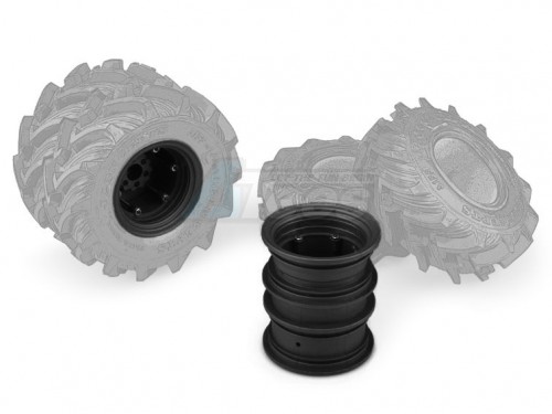 The wheels interlock, like a tongue and groove concept, that key together and provide rock-solid alignment and forward drive. For a scale look and clamping force, a long screw is built from the inside, clamping the wheels together like the scale counterparts they were designed after. Like other monster wheels by JConcepts, a bolt-in hub adaptor was created to match a huge variety of trucks while also offering different overall widths to choose from. The bead of the wheel features a 3 step surface which provides a massive amount of area for glue to rest giving the utmost security for full-throttle mud runs.