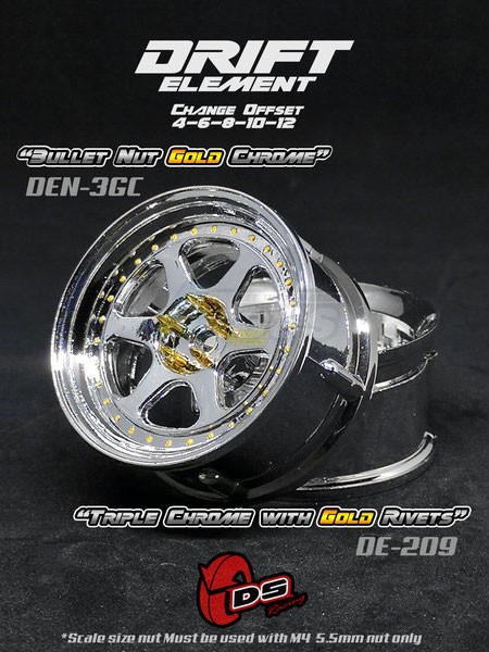 • Factory description: DS Racing Drift Element Wheel II - Adj. Offset (2) / Triple Chrome with Gold Rivets