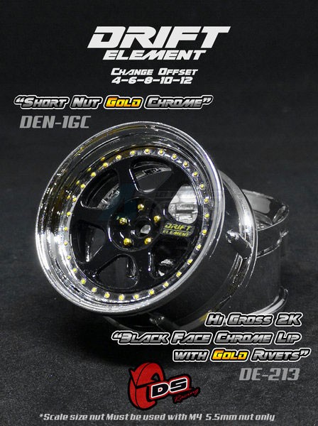 • Factory description: DS Racing Drift Element Wheel II - Adj. Offset (2) / Hi Gross 2K Black Face Chrome Lip with Gold Rivets