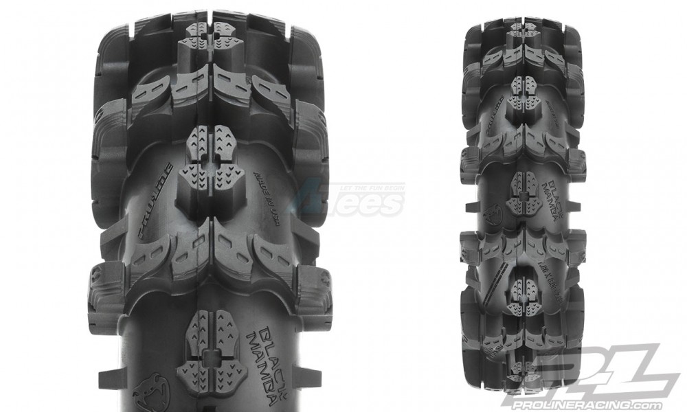 Pro-Line's officially licensed Interco Black Mamba tires feature a directional tread pattern just like the full-size tires and are just as tough and aggressive as the real thing. Every detail is captured including the lettering on the tire carcass and the multi-stepped tread. Made from Pro-Line's legendary M2 compound for maximum mud flinging traction from the start. Don't get stuck in the mud with the wrong tires. Get your own set of fully licensed Interco Black Mamba tires from Pro-Line today!