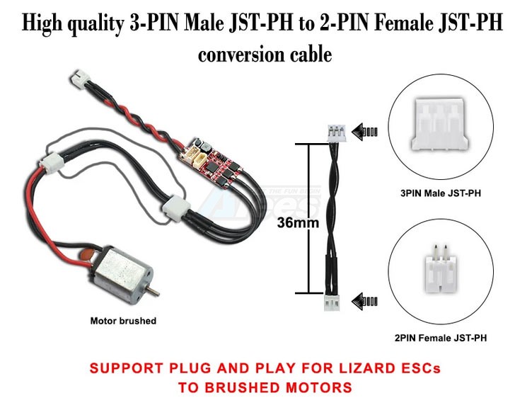 Application: for brushed motors that have 2-PIN Female JST-PH connectors ready to use with Lizard escs.Note: NOT suitable for Furitek MOMENTUM esc
