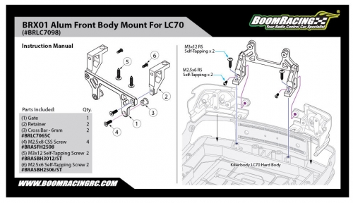 - Factory description: Boom Racing BRX01 Aluminum Front Body Mount for LC70