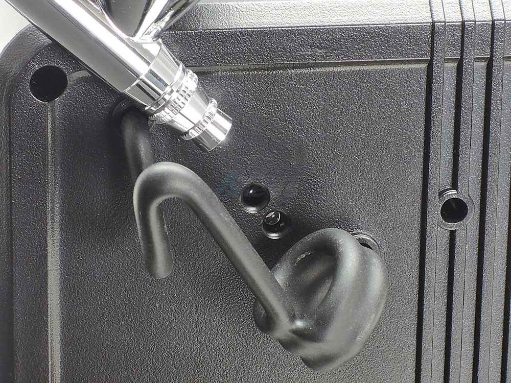 • Removing the airbrush from the hanger starts the compressor, and replacing it stops air flow. Easy!