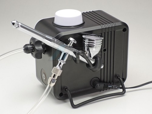 • This is a highly compact air compressor, shown with a separately sold airbrush on the handy hanger.