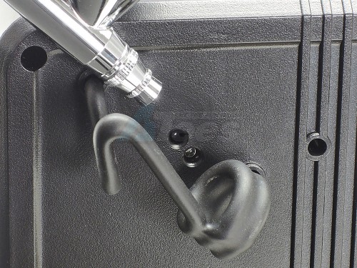 Airbrush hanger works with sensor switch, turning on the compressor when the airbrush is removed, and off when the airbrush is replaced again.