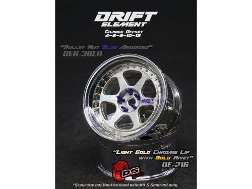 • Factory description: DS Racing Drift Element Wheel II - Adj. Offset (2) / Light Gold Chrome Lip with Gold Rivets