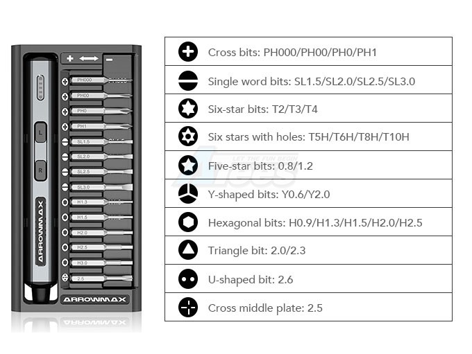 • Factory description: Arrowmax SES Mini Electric Screwdriver With Aluminium Case (28 in 1) Space Gray