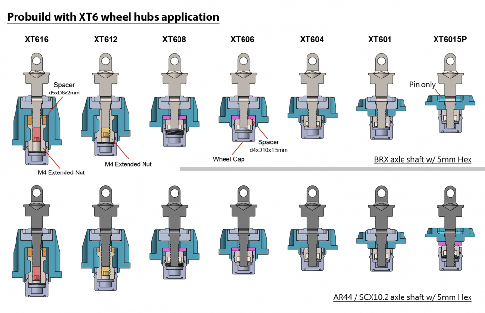 - XT6 hubs will fit driveshafts using M4 and M5 wheel nuts