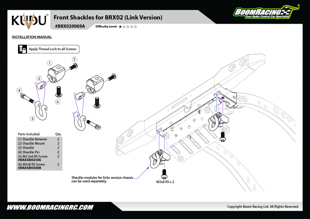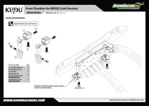 • Factory description: Boom Racing BRX02 Front Shackle & Retainer for BRX02 4-link Version