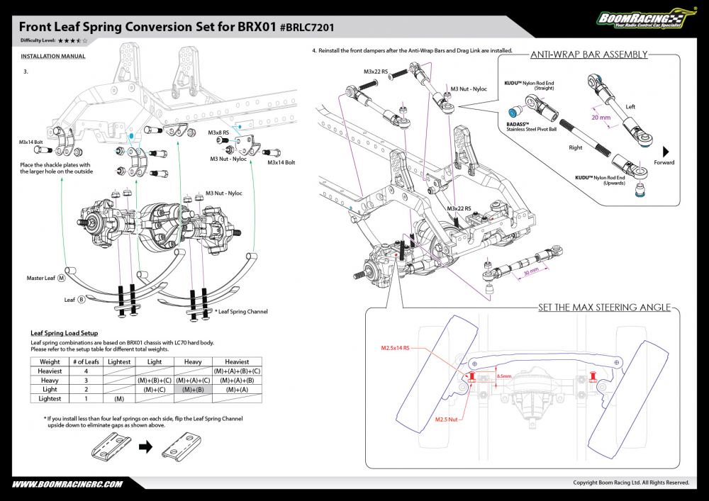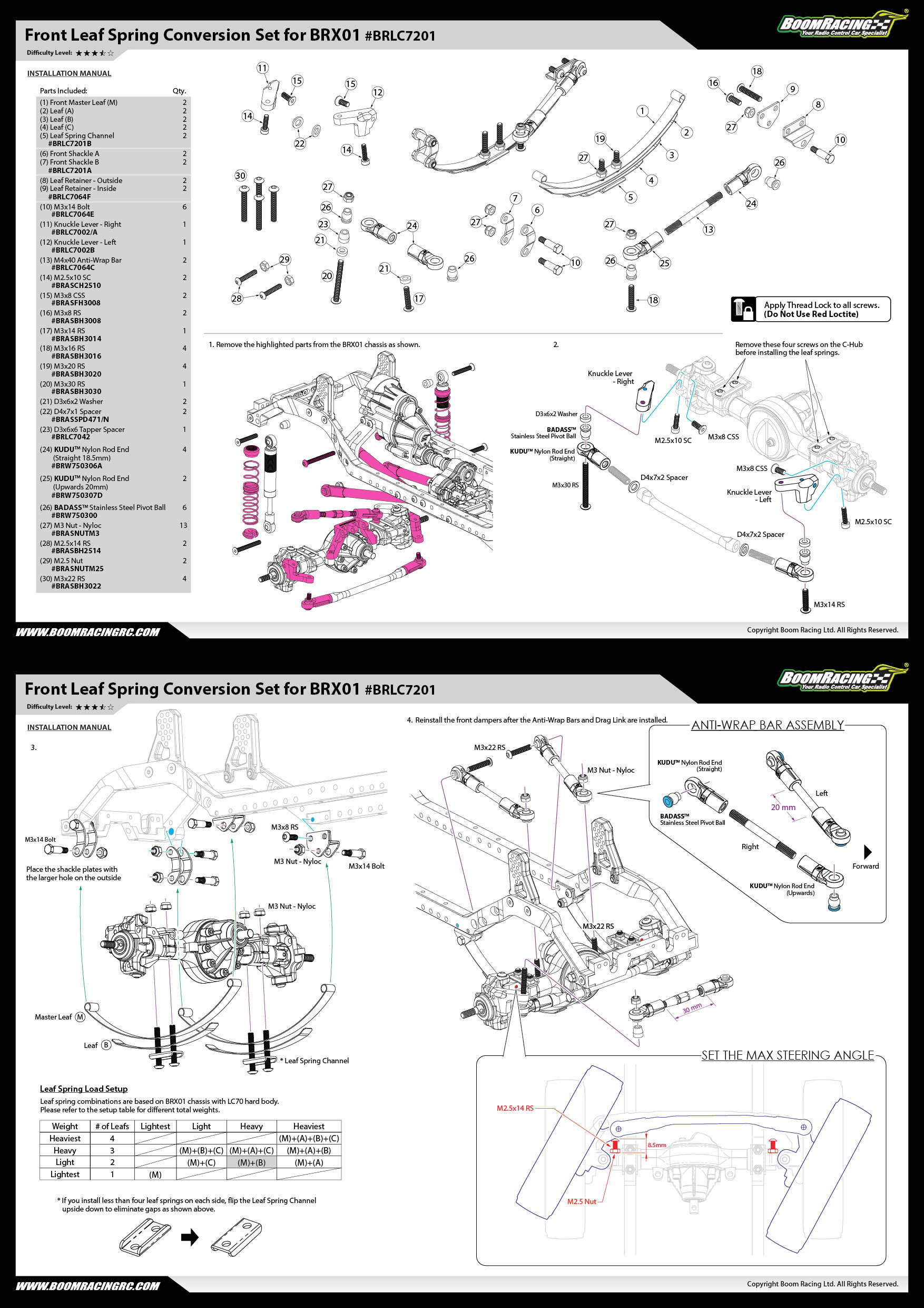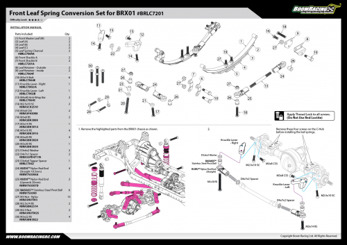 This is a complete front leaf spring conversion kit for the BRX01. Convert the original link suspension geometry into leaf spring suspension.