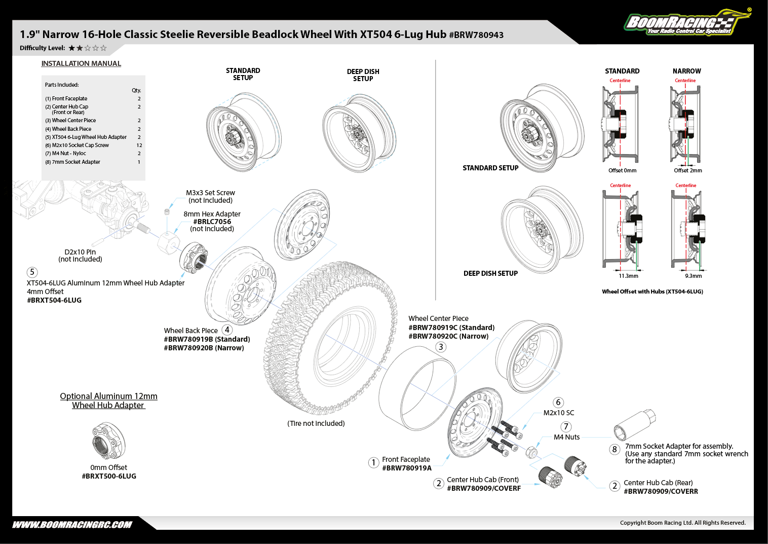 • Factory description: Boom Racing 1.9" 16-Hole Classic Steelie Reversible Beadlock Wheel w/ XT504 6-Lug Hub Front (2) Gun Metal