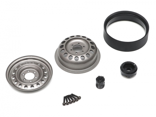 The front face is made of pressed steel for accurate scale looks. Comes with aluminum center rings and the back wheel piece is made from cast metal.